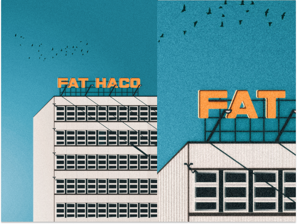 The second illustration has a title, I like fat. It doesn't have much meaning, except for the caption "FAT HACO." It is a factory of automatic lathe machines. I have good memories of it because I worked, lived and studied right next to it. I often walked around, waited at the bus stop, was angry, sad, happy, happy and in love, and this object looked at me, without telling me anything, just stood there, like many other buildings around. He mesmerized me, so I feasted on his inscription, and the now old disgusting windows.