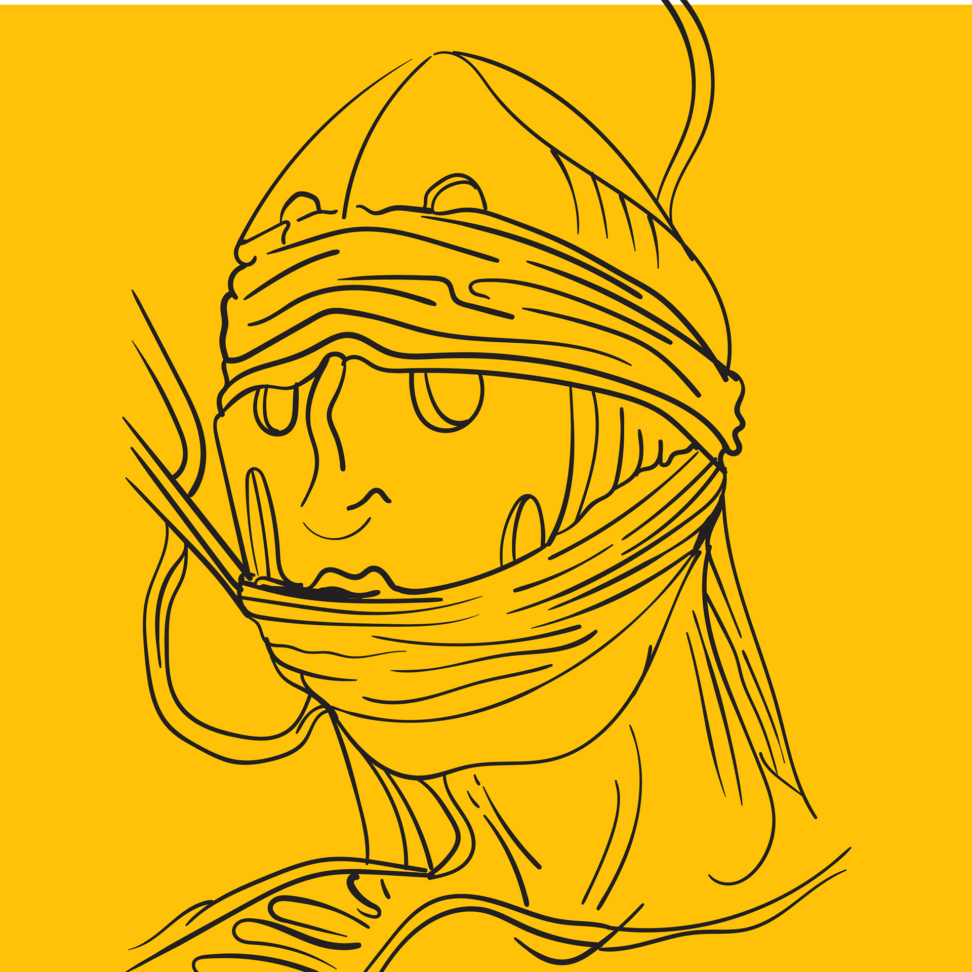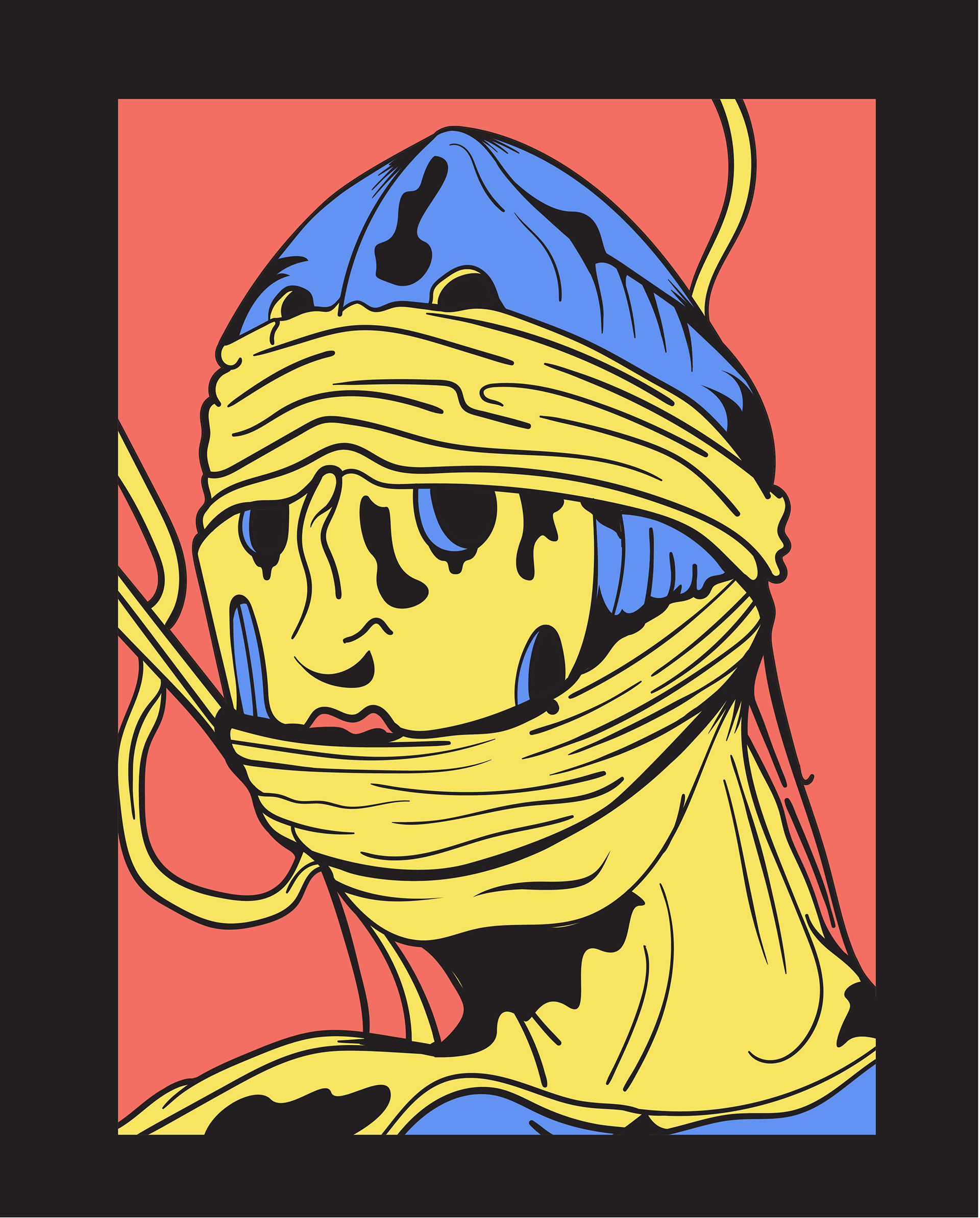 The illustration shows a character wearing a mask, he is surreal but also has a post-apocalyptic feel to him. In 2020, we all had the opportunity to wear masks. Masks are elements that are often associated with the future, this apocalyptic future. It is often related to the world climate, conditions, political situation, etc. It is often caused by polluted air. Maybe one day we will wear masks to hide our identity from cameras that identify our faces.