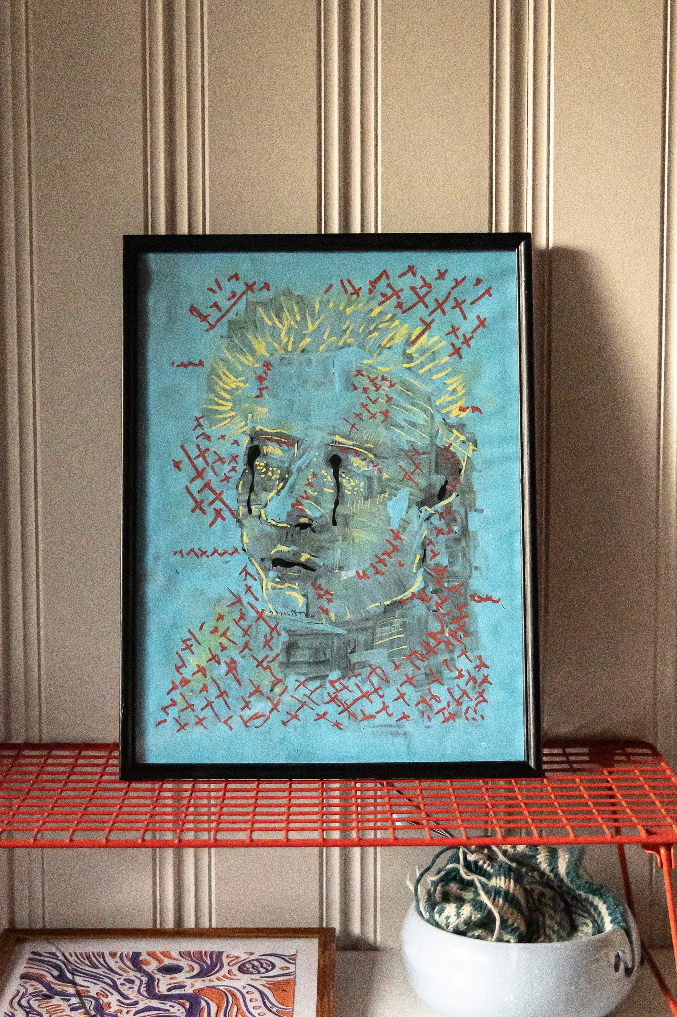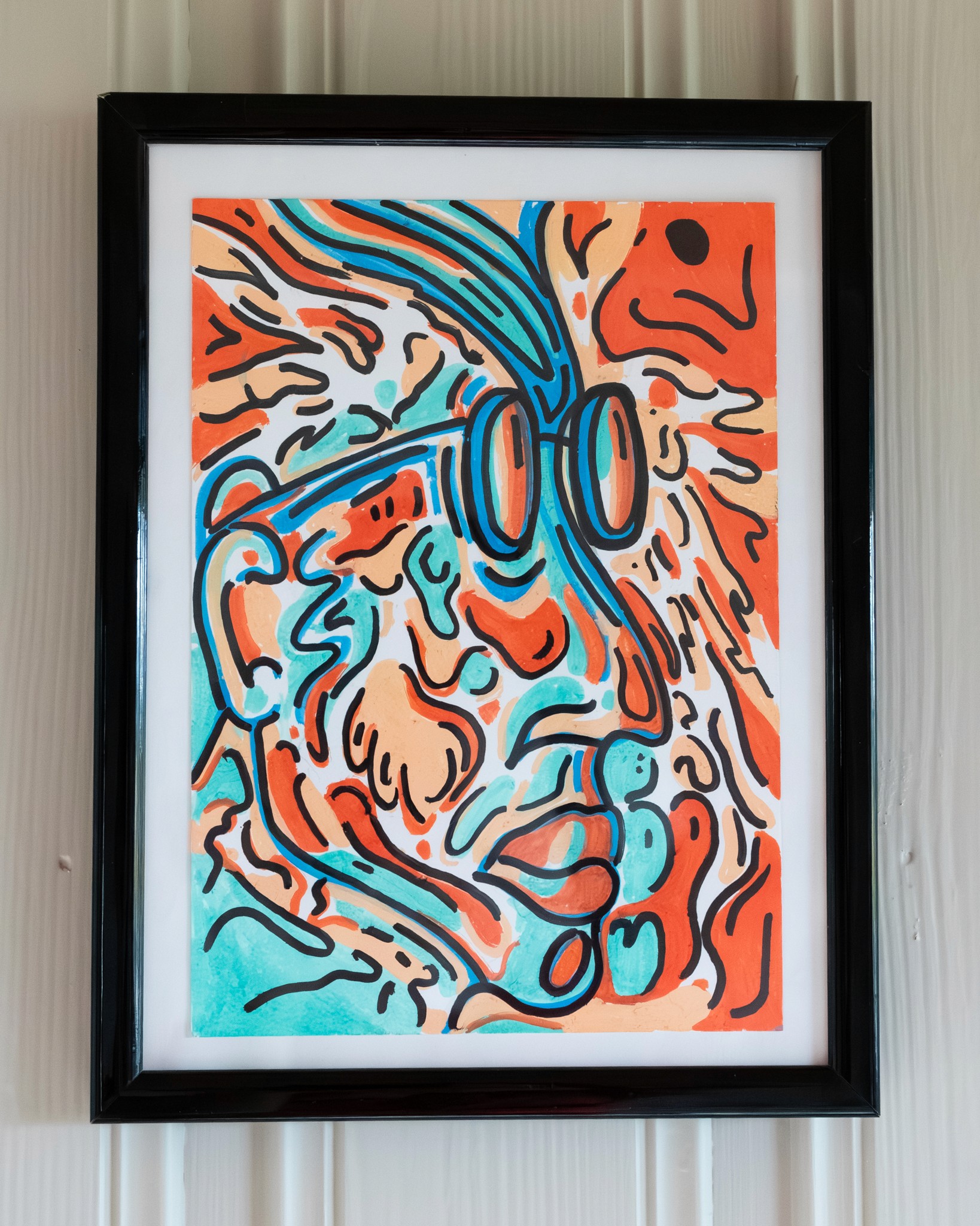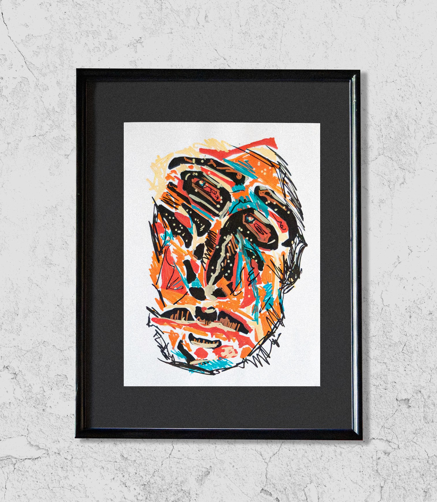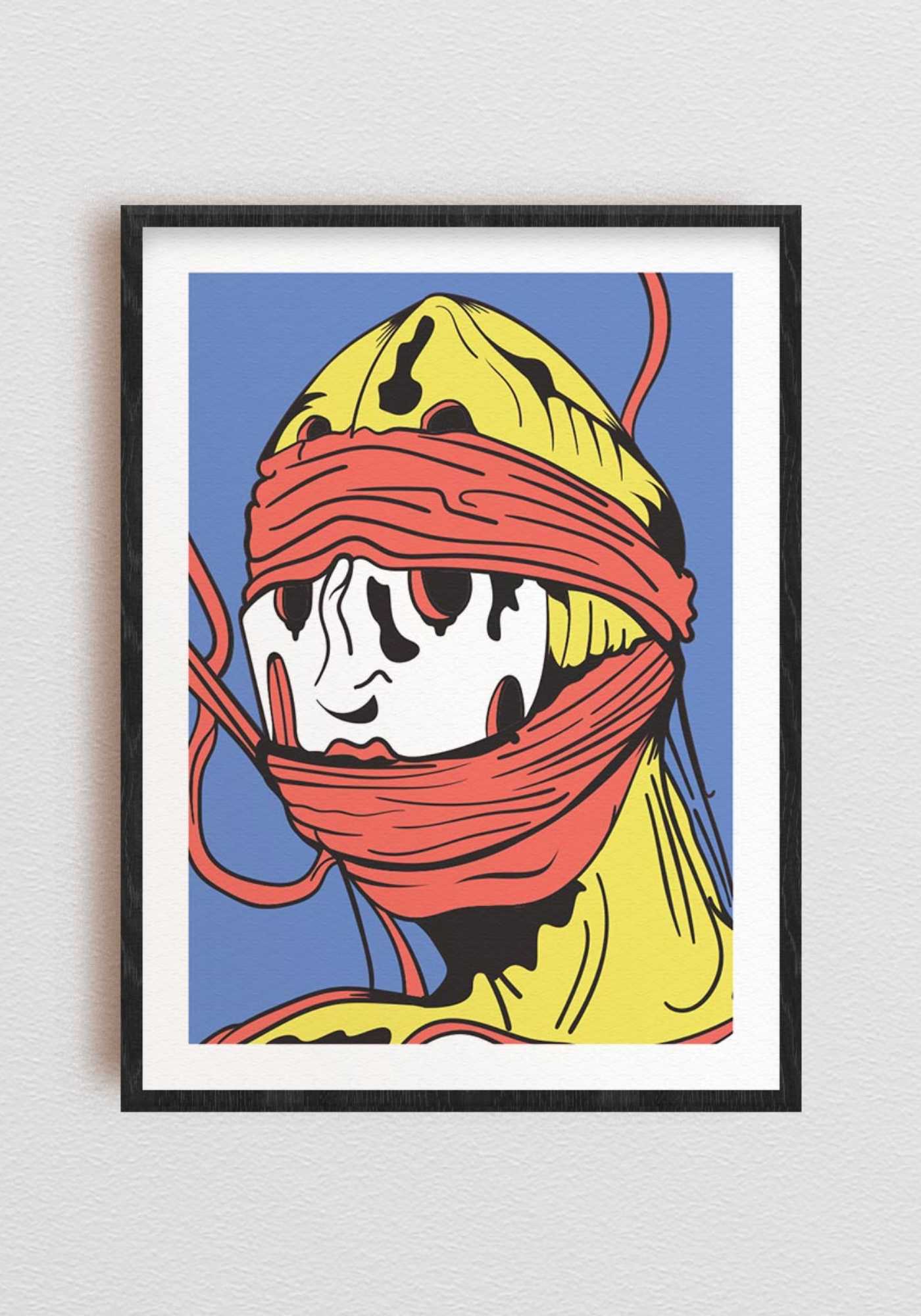 Kunsttrykk med abstrakt portrett i en fargerik stil. Trykket har sterke kontrastfarger som gul, rød og svart, og er egnet for innramming. Perfekt for moderne interiør og kunstsamlinger.