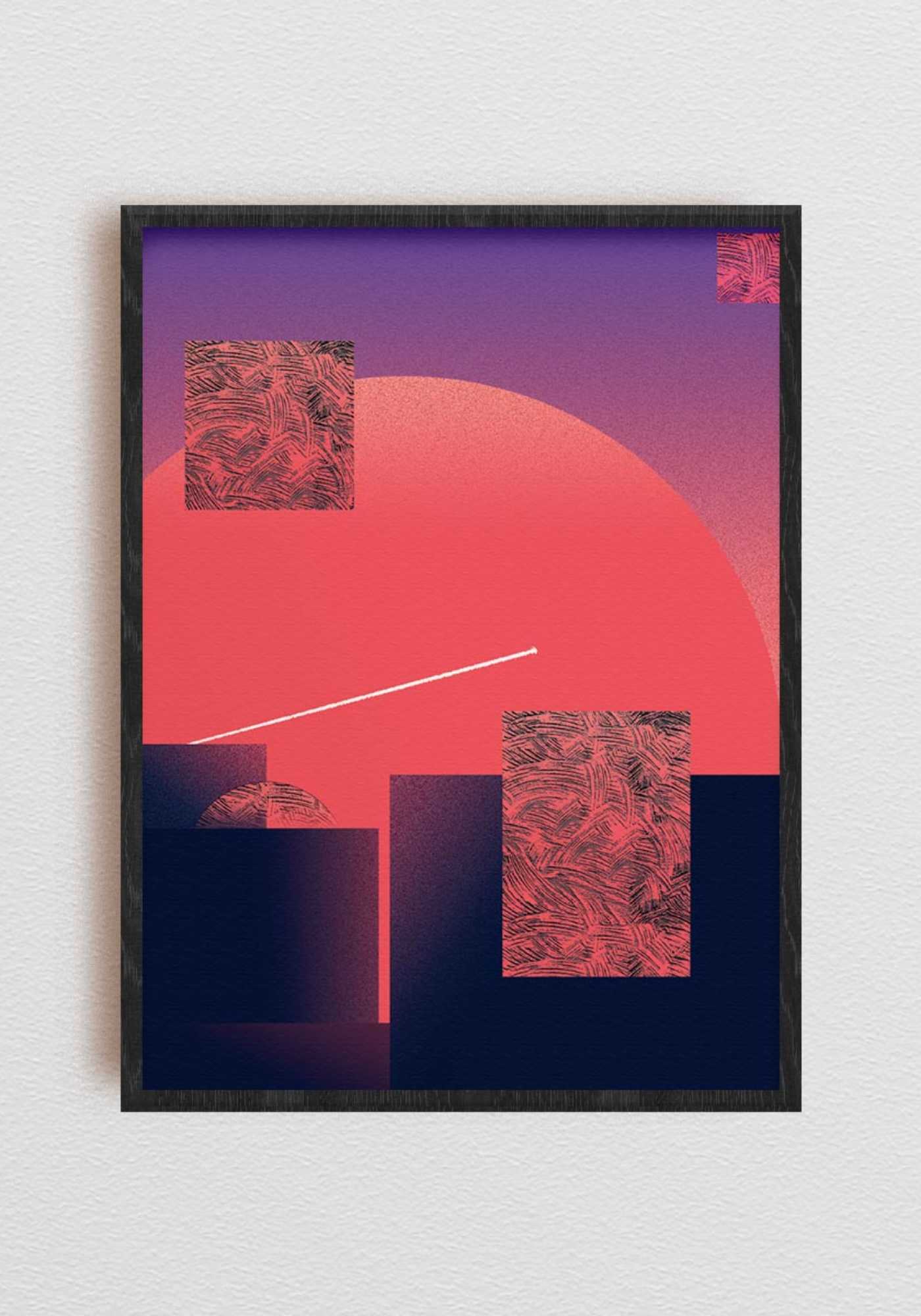 Kunsttrykk med abstrakt design i røde og lilla toner. Plakaten har geometriske former og en moderne stil, ideell for dekorasjon i hjemmet eller på kontoret. Den er trykt på kvalitetsmateriale som sikrer langvarig holdbarhet.