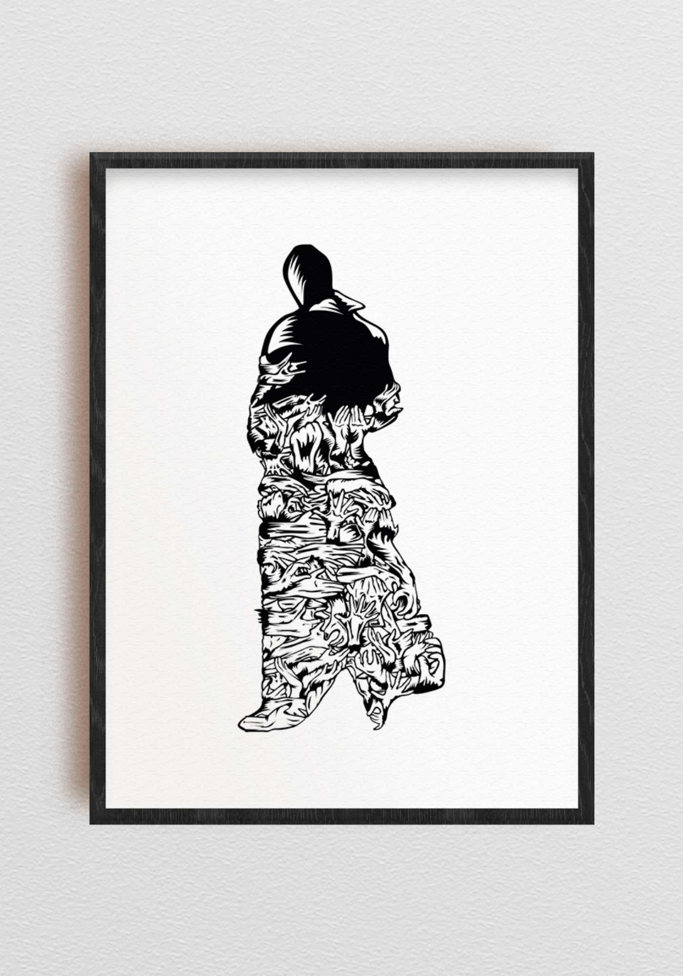 The image shows a person standing with their body made entirely of hands that are all tied together. These hands act as support, pressure, and constraint, forming a collective mass that shapes the individual from the outside in. The figure becomes a place where all kinds of perspectives, influences, and experiences come together.